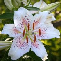 Метровая лилия Мускадет из группы восточных гибридов в период цветения будет дарить вам и окружающим ощущение настоящего праздника, ведь ее бутоны – это что-то невероятное! Слегка волнистые остроконечные лепестки – это сочетание молочно-белого и розово-сиреневого оттенка, гармонично разбавленного темно-бордовым мелким крапом и ярко-оранжевыми пыльниками. На одном цветоносе может располагаться до полутора десятков соцветий! А каждый цветок – по 16-18 см в диаметре! Даже не верится, что эта хрупкая красавица может выдержать такой «груз».